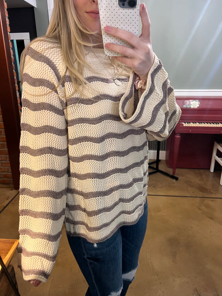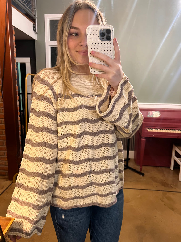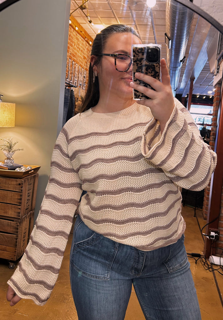 Soft cream and lavender stripes paired with bell sleeves for a touch of whimsy. This lightweight open knit sweater is everything your closet needed.
