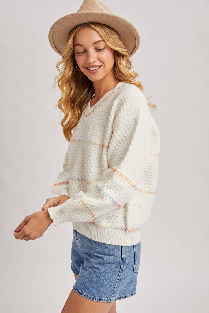 This sweater is crafted from a cozy, off-white knit with a distinctive waffle-like texture all over. Its standout feature is the whimsical, rainbow-colored cross-stitching that beautifully trims the classic v-neckline and runs in delicate horizontal stripes across the body and sleeves. This playful detail adds a pop of color and a touch of handmade charm to the comfortable, relaxed-fit silhouette. Finished with traditional ribbed cuffs and hem, this sweater is the perfect piece.