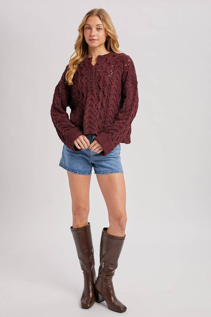 This stylish and textured long-sleeved sweater showcases an intricate and varied cable knit and open-knit pattern artfully integrated throughout its design, further featuring a classic rounded neckline with a partial button placket and finished with comfortable wide ribbed cuffs.