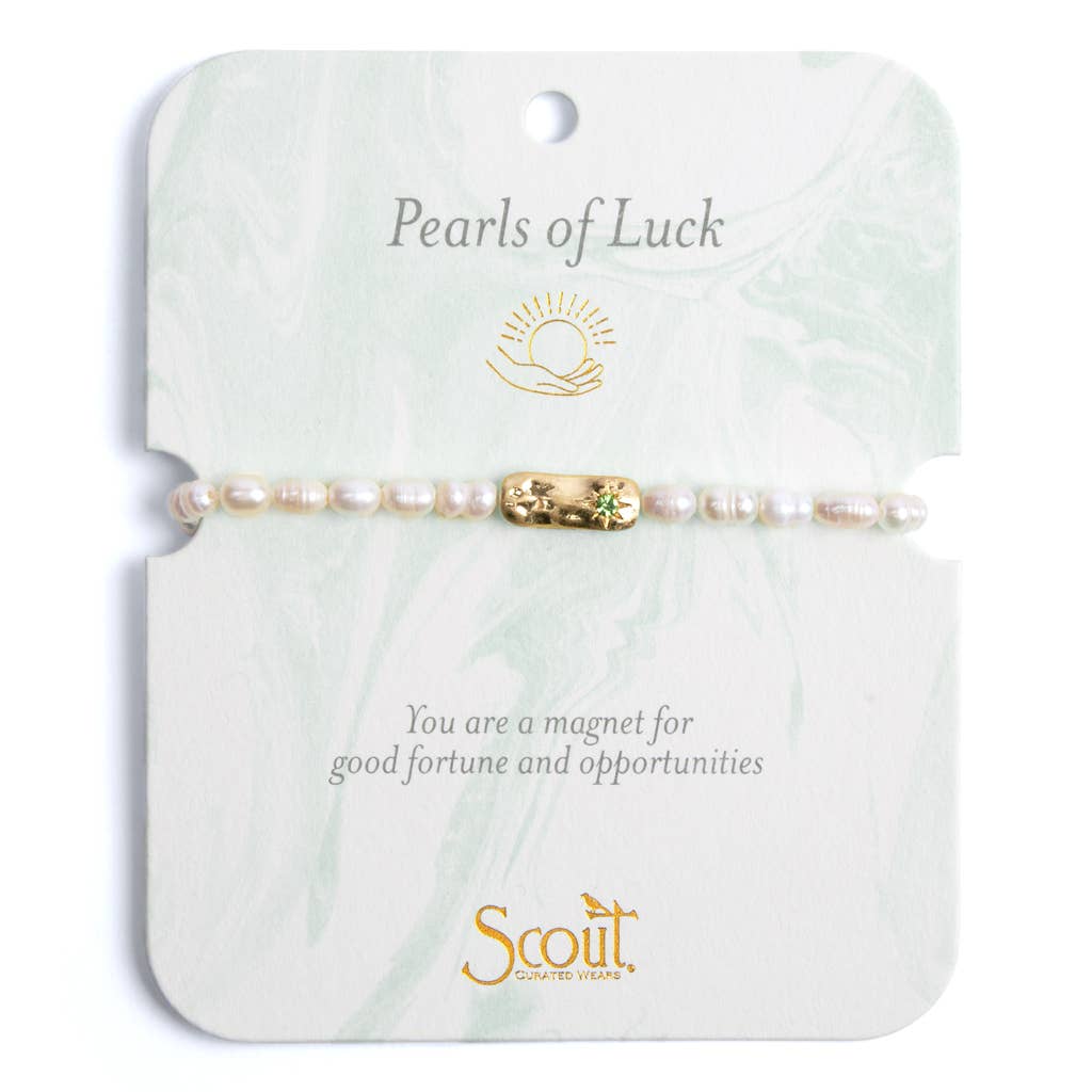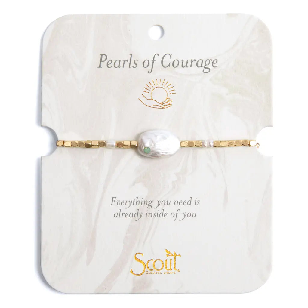 Elevate your spirit with tokens of affirmation! Engravings and inset crystals represent an affirmation. Natural rice pearls are intertwined with organically shaped medallions on each bracelet.