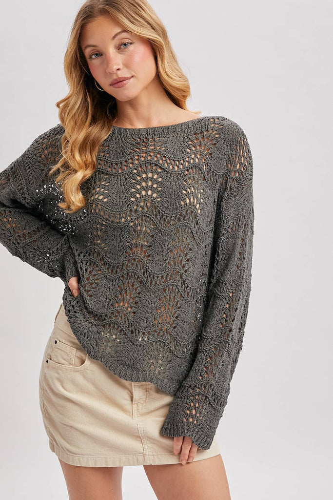 Ash Grey Scalloped Hem Open Knit Sweater