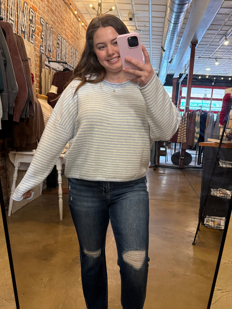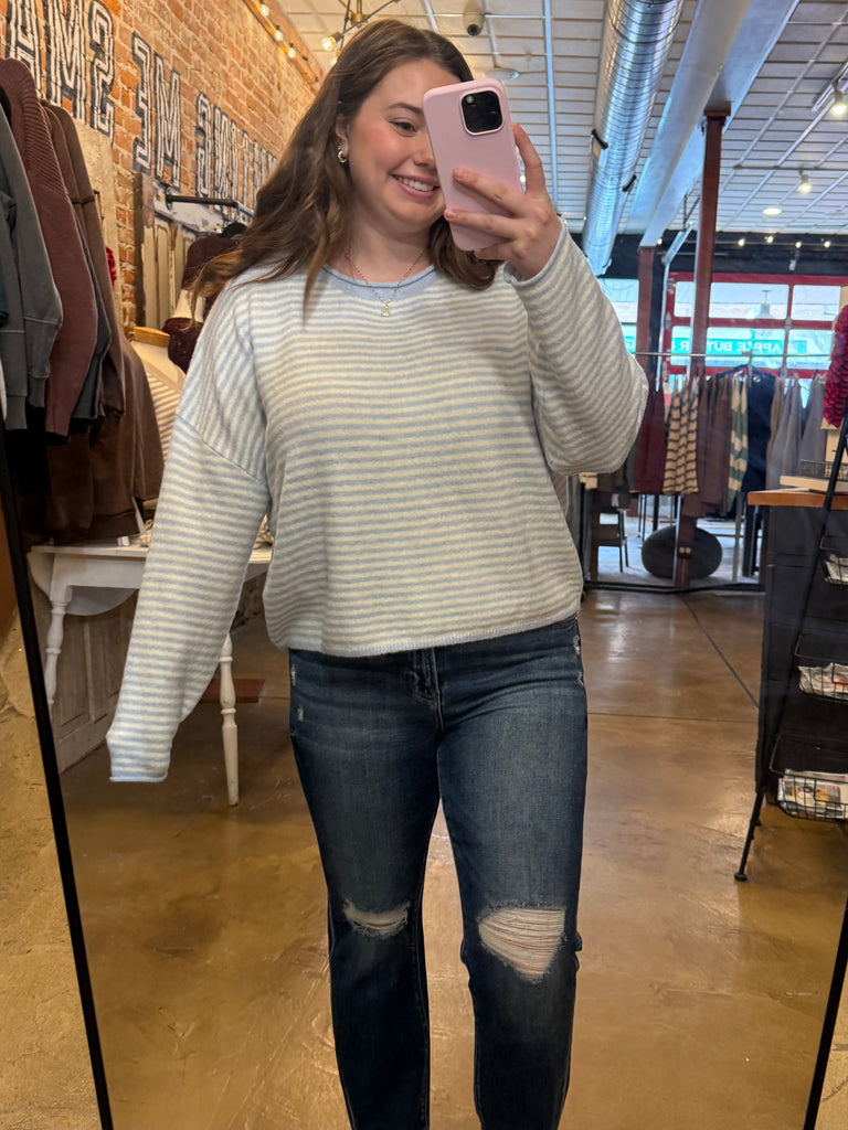 A soft lightweight striped knit top with a relaxed and airy silhouette. Fabric and fit made from a soft and breathable knit with a gentle brushed texture that feels light against the skin. Designed with a relaxed drape and an easy slightly cropped length that sits naturally at the waist. The drop shoulder construction adds comfort and gives the piece a calm effortless shape suitable for warm or transitional seasons.