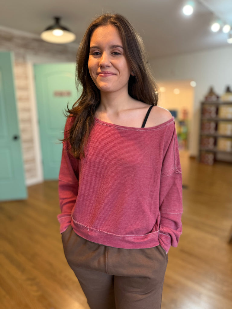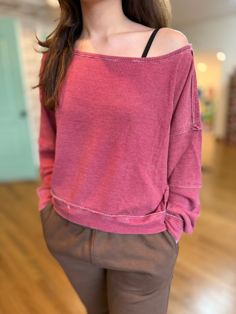 A laid-back essential with an edge. This cotton blend boat neck long sleeve features a mineral wash finish for a lived-in look, waffle knit fabrication for texture, and raw edge details that add effortless character. Designed with a drop shoulder, back seam, and sleeve seam accents, it’s the perfect blend of casual comfort and modern detail.