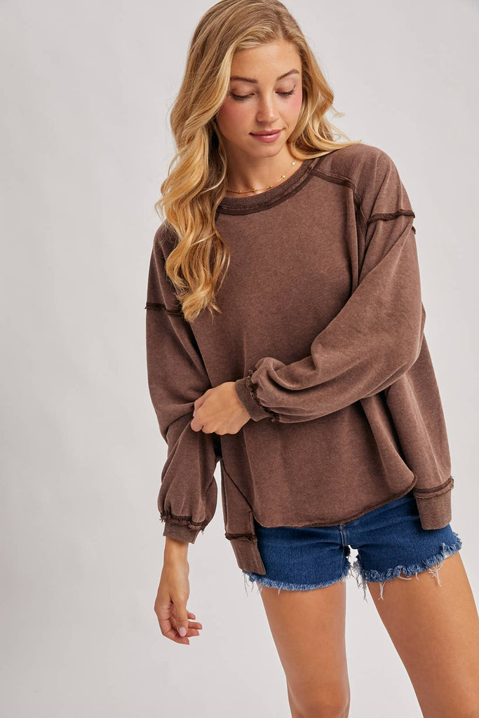 Achieve the perfect lived-in look with this oversized, vintage-wash sweatshirt in a cool, faded mocha. Crafted for ultimate comfort, it features a classic crew neck, dramatic balloon sleeves, and a flattering high-low hem with deep side slits. Edgy details like exposed seams and distressed, raw-edge trim on the cuffs and hem give this pullover a unique, deconstructed vibe. It's the ultimate cozy staple for effortless, everyday style.