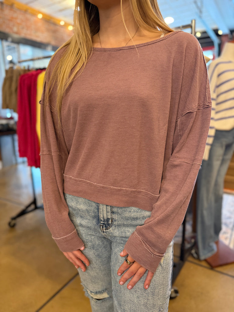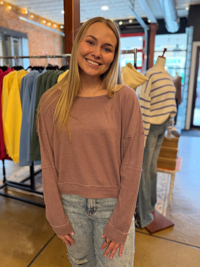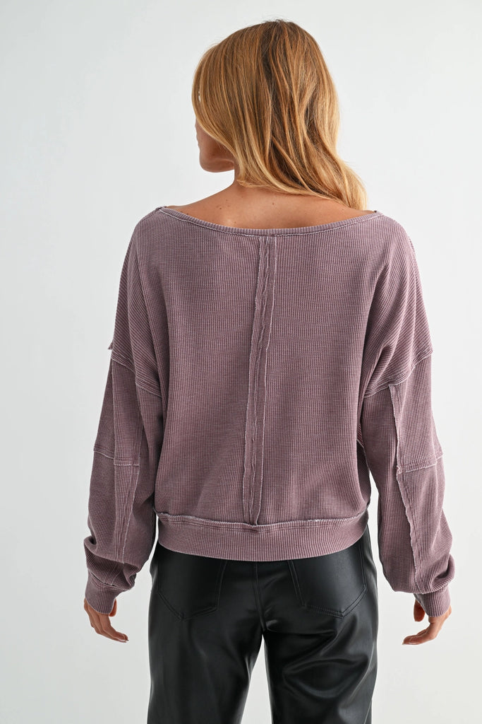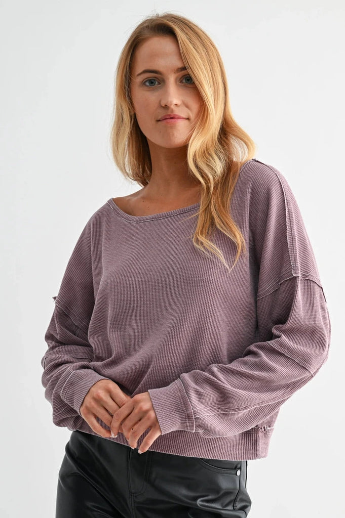 A laid-back essential with an edge. This cotton blend boat neck long sleeve features a mineral wash finish for a lived-in look, waffle knit fabrication for texture, and raw edge details that add effortless character. Designed with a drop shoulder, back seam, and sleeve seam accents, it’s the perfect blend of casual comfort and modern detail.
