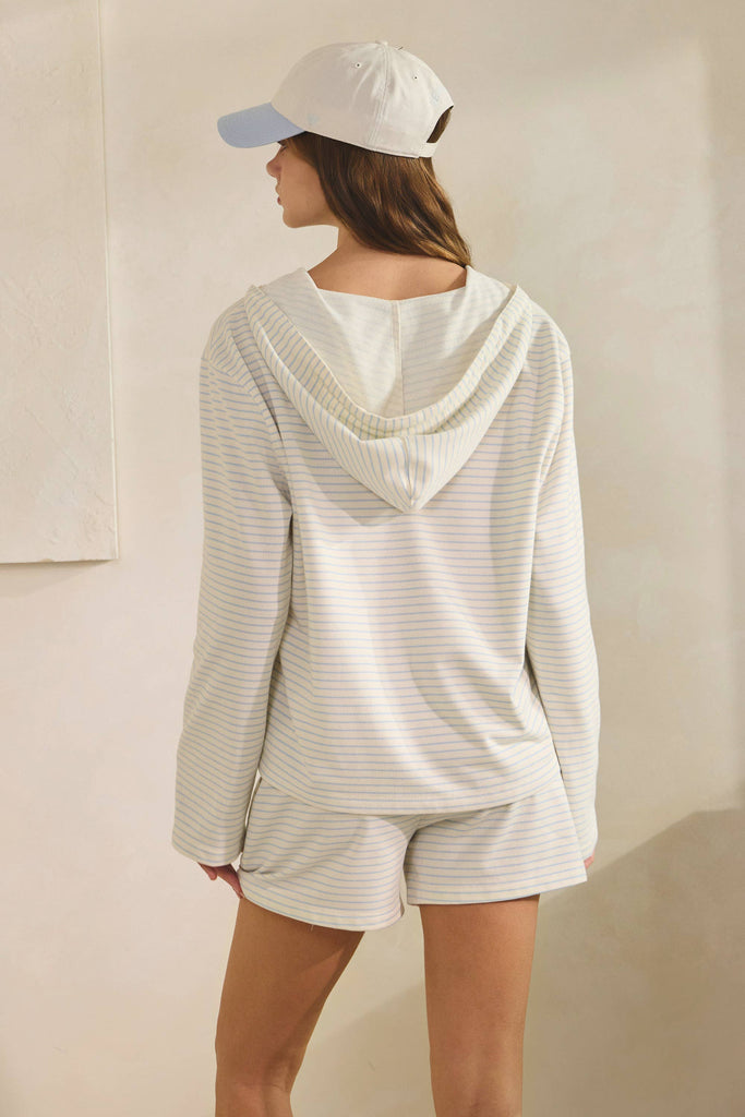 A lightweight striped hoodie with a relaxed coastal inspired silhouette. Fabric and fit made from a soft breathable cotton blend that offers a smooth hand feel and gentle stretch. The fabric drapes naturally without heaviness and provides comfortable movement for everyday wear. Designed with a loose relaxed fit featuring an easy V neckline and rope inspired drawstrings for a casual laid back look.