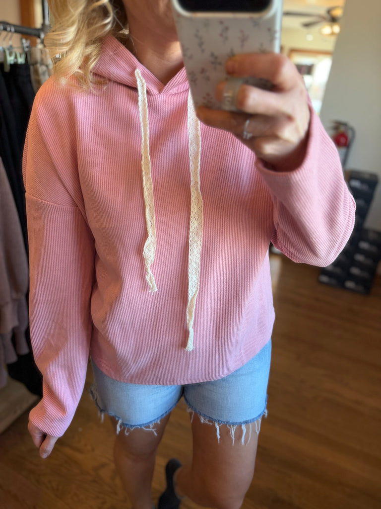 Mauve Ribbed Drawstring Hooded Sweatshirt