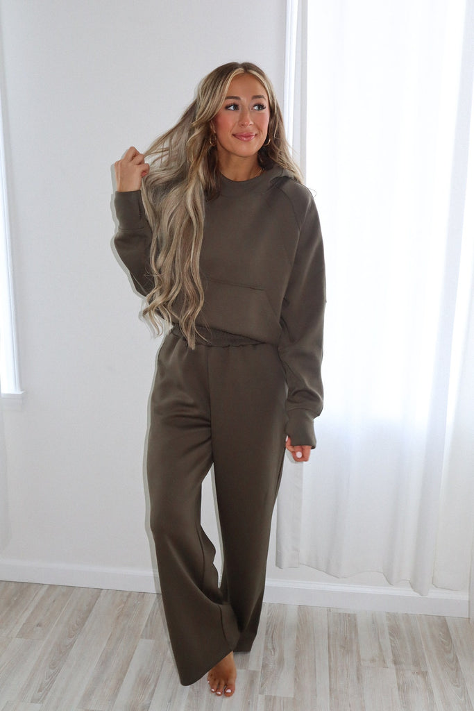 This scuba hoodie features a sleek mock neck, kangaroo pocket, and a comfy relaxed fit. Made from soft, structured scuba fabric, it’s perfect for layering or lounging in style.