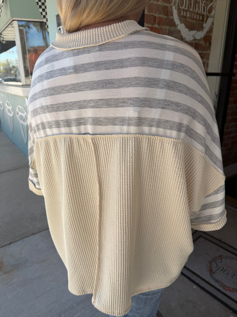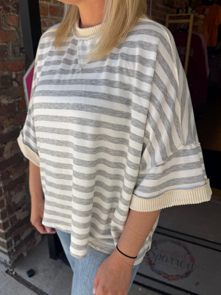 Loose fit, crew neck, oversized short sleeve color block stripe french terry knit top with out seam overlock and reverse stitches