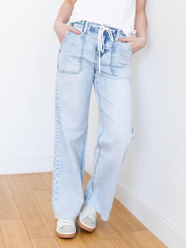 Drawstring wide leg jeans in comfort stretch denim.
