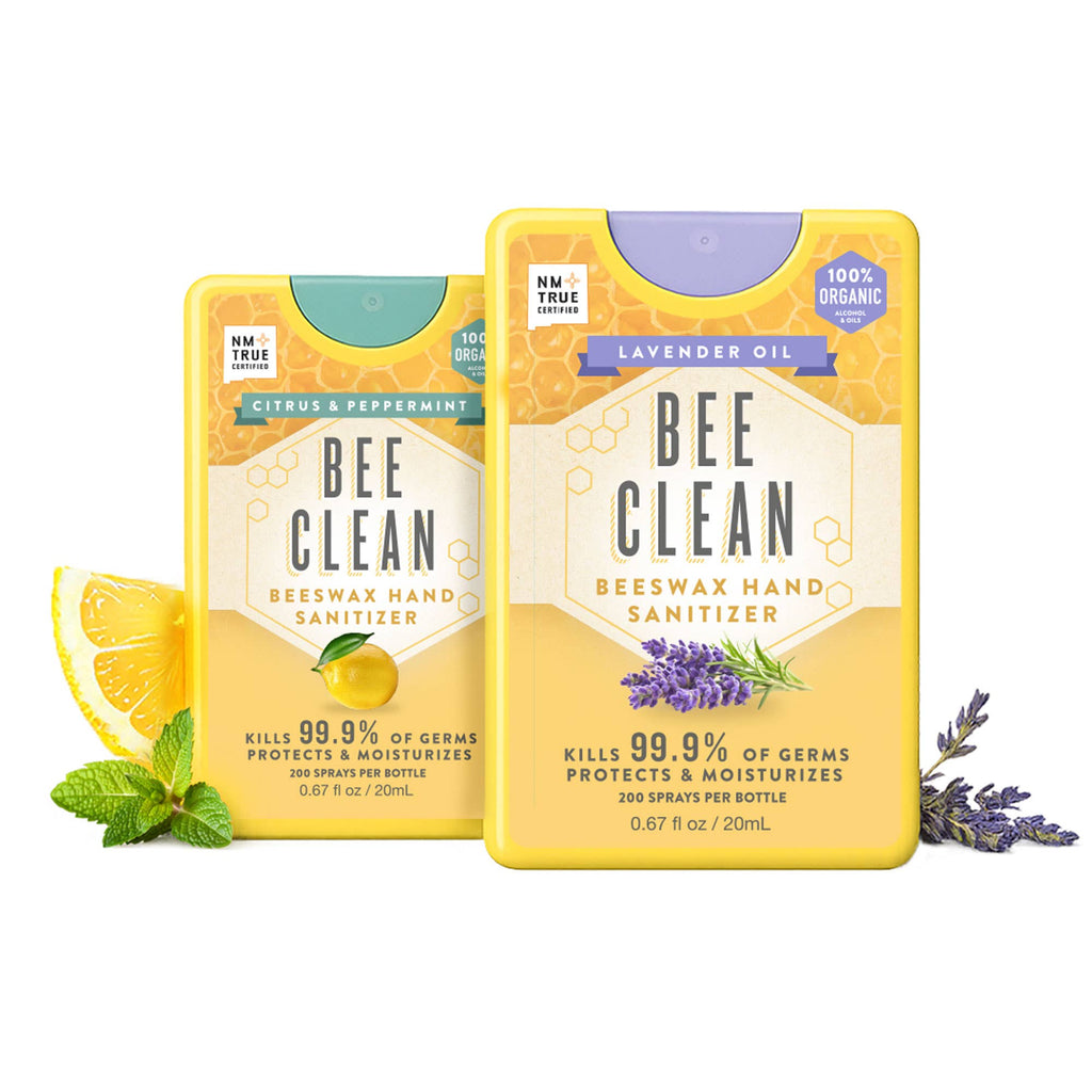 Bee Clean Beeswax Hand Sanitizers help you stay healthy and humming by killing germs with kinder, 100% organic and natural ingredients. Our spray-on mist is mess free via our convenient, innovative, recyclable packaging. Bee Clean contains natural antimicrobial peptides and organic ethyl alcohol to kill 99.9% of germs. It moisturizes using beeswax, vitamin E, avocado oil and apricot seed oil so hands feel soft and dry with no sticky residue. Our refreshing citrus peppermint and lavender essential scents are light and revitalizing.