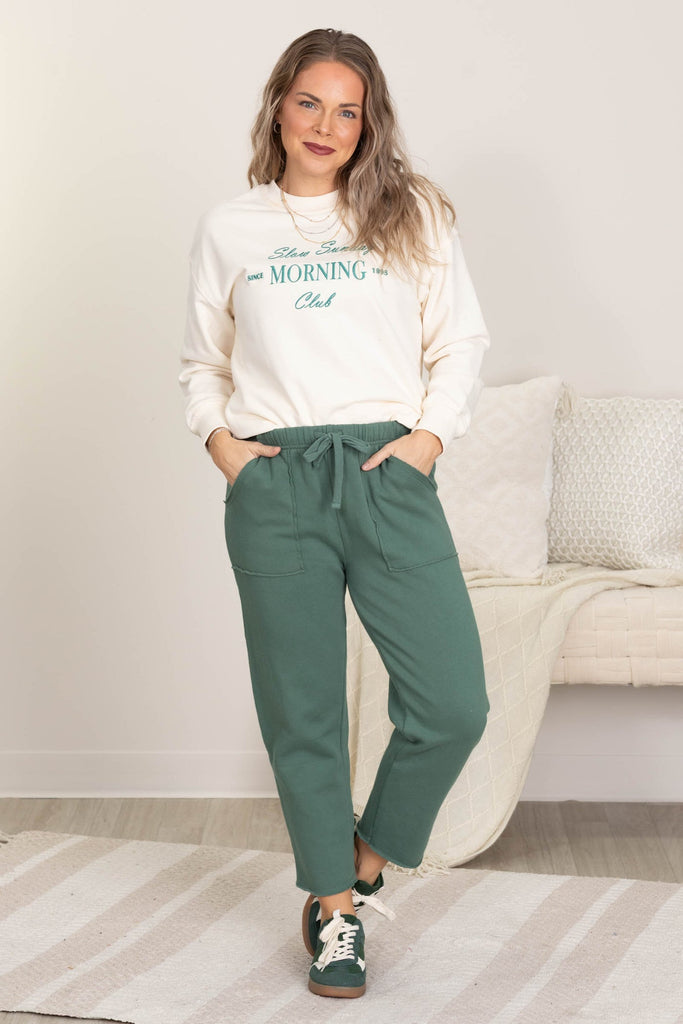 Your new off-duty favorite. These straight leg lounge pants feature a unique tapered raw-edge hem that curves around the ankle for a laid-back, lived-in look. Made from ultra-soft, garment-washed cotton, they’re designed with raw-edge patch pockets and a comfy drawstring waistband.